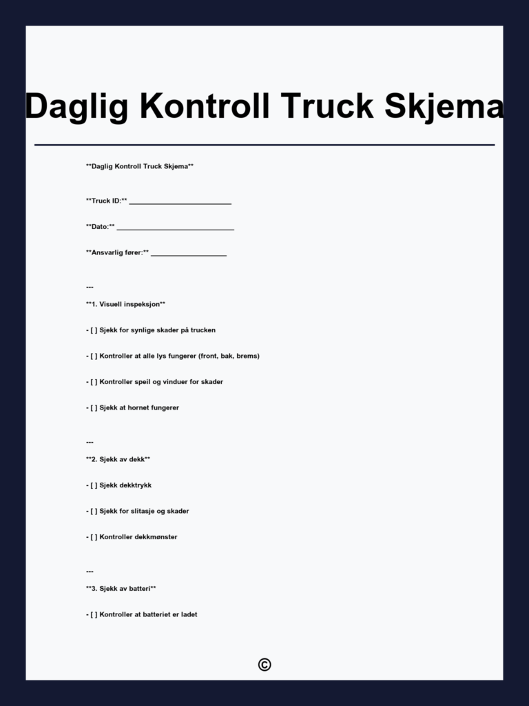 Last ned gratis daglig kontroll skjema for truck og lær hvordan du enkelt sikrer trygg og effektiv drift på arbeidsplassen med riktig dokumentasjon og samtykke.