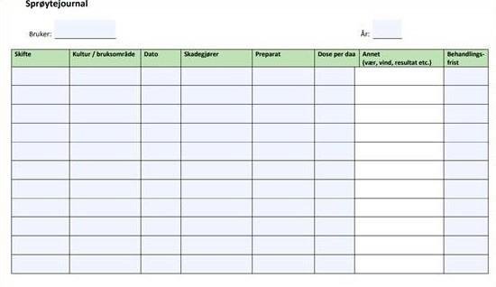 Last ned gratis sprøytejournal skjema oppdatert etter gjeldende helseforskrifter. Sikre korrekt dokumentasjon og benytt deg av 14 dagers ubetinget angrerett. Enkel og trygg nedlasting.